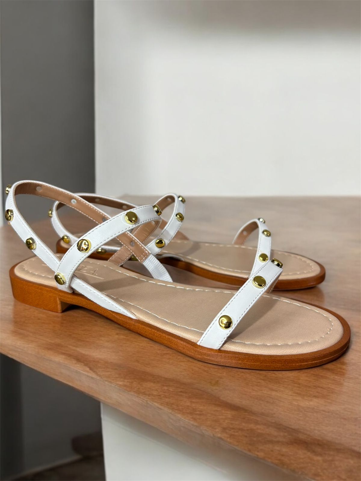 Minimalismo con un toque luminoso. Ariana es un flat con base tipo maderita en color blanco, realzado con detalles en dorado que aportan elegancia sin esfuerzo. Un diseño fresco, versátil y delicado, ideal para acompañarte del día a la noche con ese brillo sutil que eleva cualquier look.